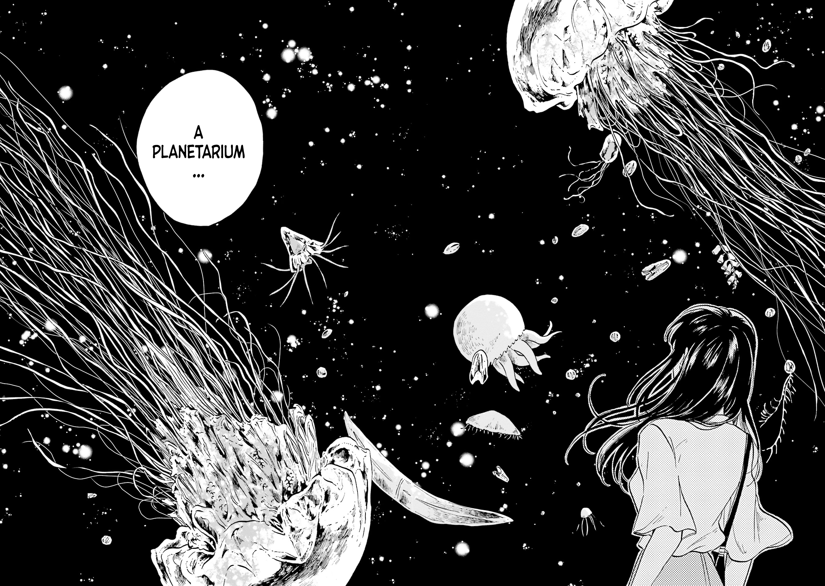 Another thing I like to add is that Kiyomi Sugishita seems to be trying to draw the marine snow, looks like a cluster of star sometimes. Creating a glimpse, looks like they're inside of a planetarium full of deep-sea animal.