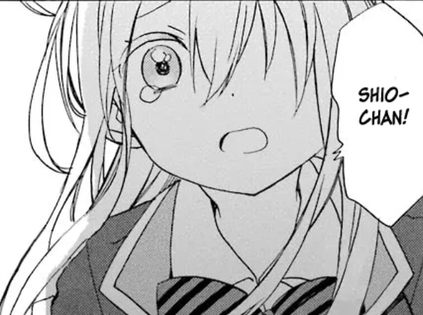 The dramatic irony of her unwittingly playing both sides of Satou and Asahi's distant chess game and her fear and indecisiveness ultimately catch up to her, though. Her efforts to push into Satou's life result in Satou testing her ability to handle difficult or shocking things by taking Shouko to her aunt's apartment. Afterwards, Satou asks if Shouko will still be her friend, regardless of her relation to such a disgusting person — a question Shouko can only answer by looking away from her friend in silence, having momentarily been unable to see Satou as anything other than a product of her upbringing. This permanently shatters the trust between Satou and Shouko, with Satou deeply hurt by her friend's inability to understand her. When Shouko eventually finds Satou and Shio's apartment and takes a picture of the two them together, Satou simply cannot trust her anymore. Satou spends the ensuing conversation between them lying to herself about not feeling anything for her friend, preparing herself for what she's about to do. At the end, the only thing Shouko can offer her friend — having worked so hard — is tears, as Satou briefly apologizes to her before ending her life.