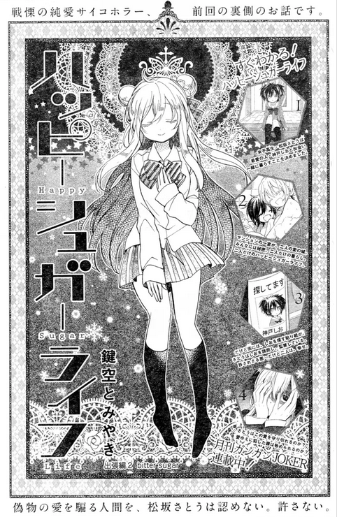 At its most basic level, Happy Sugar Life is a story about the relationship between 16-year-old Matsuzaka Satou — driven, ideological, lovestruck murderess — and Koube Shio, "pure", warm, yet suspicious and discerning child — and the people surrounding them that get drawn into their attempt to find happiness together. Shio has ended up in Satou's apartment under mysterious — at best extralegal — circumstances, and Satou is more than anything unwilling to let Shio go; Satou believes she has at last found true love after meeting Shio, and will do absolutely anything, no matter how morally bankrupt, to hang on to it. Lies, manipulation, theft, murder, anything goes for her. As of the first chapter, she already has multiple bags full of... someone's body parts sitting in an unused room: very literal skeletons in her closet. Unfortunately for her, she's not alone — and she's not the only person looking for Shio.
