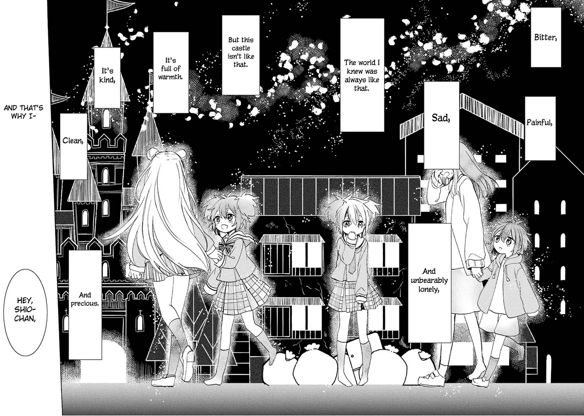 ⋆。°✩ART & AESTHETICS✩°。⋆ Much of this is down to personal taste, and I've already touched on it somewhat in the last section, but I adore the art of this manga to death. I have nothing to quibble about with it. It's heavily shoujo-inspired moe art with a somewhat ethereal feel; very light linework, high contrast between black and white elements, highly decorative pages, and skill in portraying both subtle and strong expressions. The mangaka, Tomiyaki Kagisora, is also extremely skilled in laying out pages. The whole manga is filled with creative uses of text and panel shapes that make it easier to follow characters' thoughts in a specific order. Additionally, when characters are in highly unstable emotional states or generally desperate, their linework will often become intentionally messy - this spans from everything to outlines becoming jagged and scratchy, pupils losing their perfect circular shape and becoming globs of scribbles, or entire characters being scratched out in black. The art manages to effectively communicate both sides of the emotional states of its characters in a super memorable way that gives the manga a deeply unique visual identity. Below are some example of everything I talked about, apologies for the wall of images: